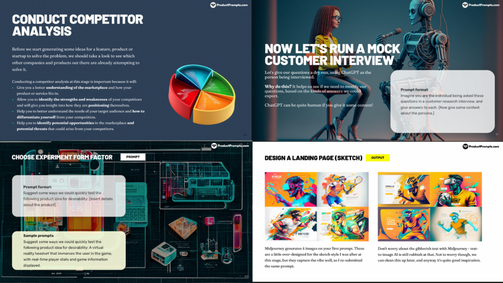 Carefully crafted prompts and prompt threads, plus case-by-case examples of prompts and outputs, as well as a fully worked example for one specific product idea. The areas covered include: